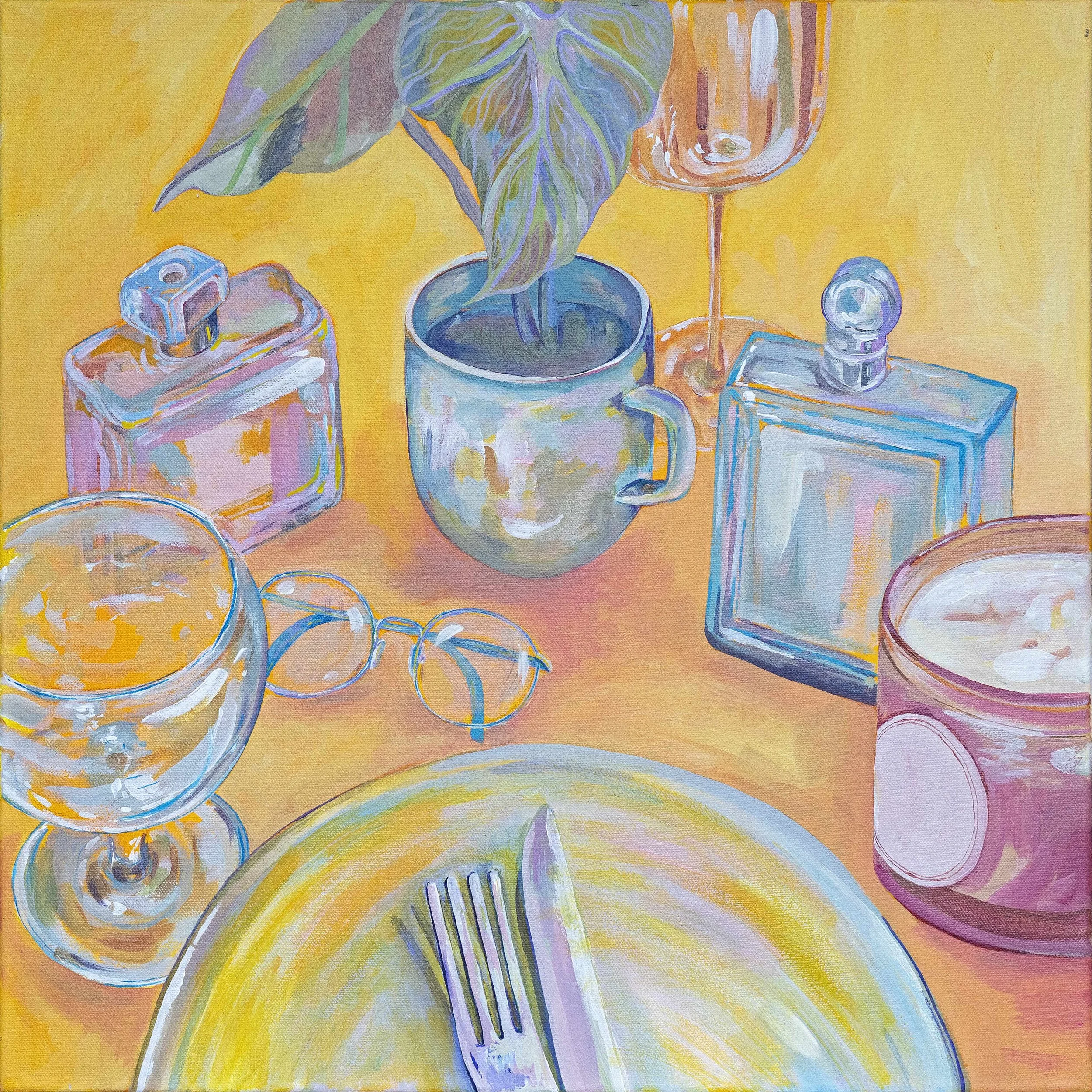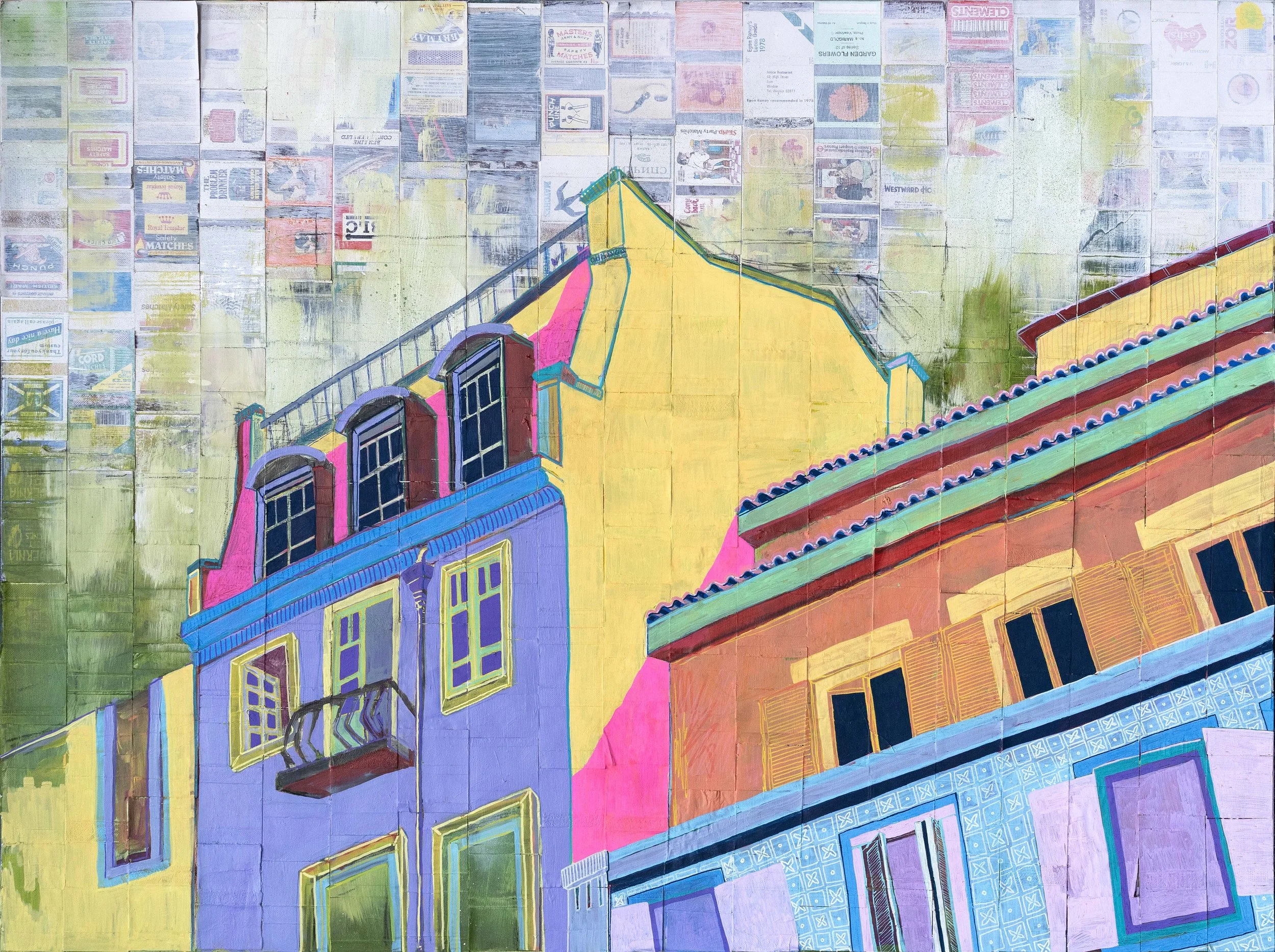 These paintings and mixed-media pieces use colour and perspective to find narratives within the ordinary. By playing with texture and found vintage materials, such as matchboxes, I look for compositions and stories in the everyday. For me, colour is a specific language of emotion and a way to showcase a slice of my world. As you see the vibrancy of each piece, I ask you to consider what it makes you think of.